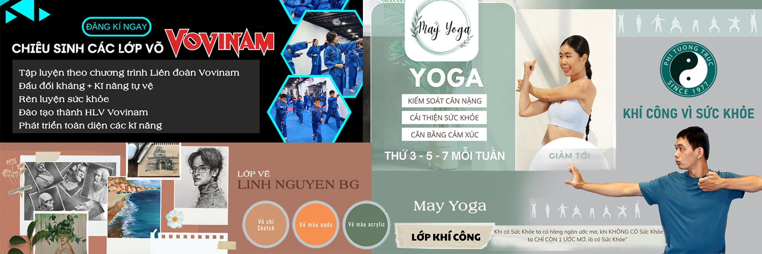 Là cung cấp các khóa học-lớp học về : VOVINAM-YOGA-KHÍ CÔNG-MỸ THUẬT với đội ngũ Huấn luyện viên dày dặn kinh nghiệm, trình độ chuyên môn cao, tận tình hướng dẫn học viên